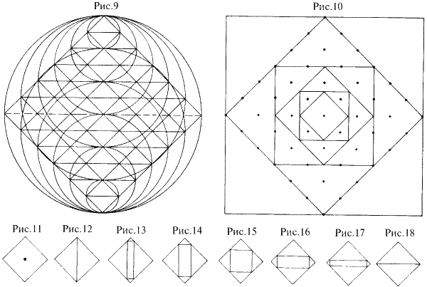 Этот значительный факт можно более ясно увидеть в рис. 11–18, где те же самые серии прослеживаются в виде прямоугольников, пунктом равновесия которых является квадрат. Безусловно, следует помнить, что здесь даются только совершенные типы, а число промежуточных типов бесконечно. Например для того, чтобы перейти от рис. 11 к рис. 12 требуется бесконечное число точек; от рис. 12 к рис. 13 – бесконечное число линий; от рис. 13 к рис. 14 – бесконечное количество промежуточных фигур, и так далее, семь бесконечностей и семь вечностей в целом.
