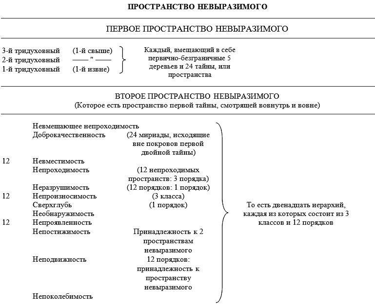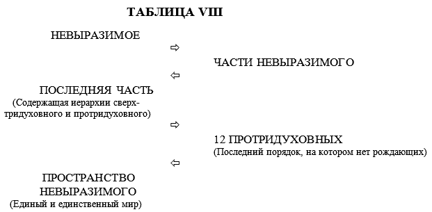 Добросовестный читатель, сравнивая уже приведенные здесь различные таблицы, ощутит некое единство в многообразии иерархий; другими словами, он поймет, что они строятся на некоем вечно повторяющемся образце, который был дан в своей простейшей форме в карте валентинианской плеромы. Каждая новая категория превосходит ту, которая ей предшествовала, пока разум неуверенно движется в этой величественной и возвышенной схеме.