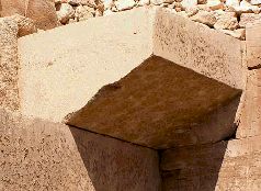 Во-вторых, есть и другая странность с блоками перекрытия. Рядом с сточенным наискось блоком (Рис. 132)лежат два других, которые заметно толще его. При этом у сточенного блока верхняя поверхность выровнена, а у соседних нет. Край этих соседних блоков явно сколот теми, кто разбирал Осирион, поэтому не ясно, выступали ли они за архитравы как и сточенный блок. Но все три перекрывают один из "отсеков"-нефов!… Что за форма потолка тогда получается?… Или мы опять имеем недоделки?…
