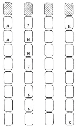 Если в одном вертикальном ряду окажутся рядом две карты одинакового достоинства, их следует вынуть и положить на валета, под которым они находятся. Если после этого рядом окажутся еще две карты одинакового достоинства, их тоже следует переложить. Также можно убрать первую и последнюю карты каждого ряда, если они одного достоинства.