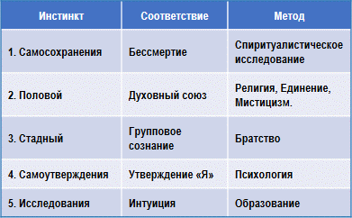 Чтобы свершить такое, нужна редчайшая отвага. Страх держит мир в рабстве, и никто не свободен от его воздействия. Для стремящегося и ученика характерны два вида страхов, которые следует особенно хорошо изучить. Страхи, описанные ранее в трактате, и страхи, свойственные, как известно, самому существованию, нам всем знакомы. Они коренятся в инстинктивной природе (экономические страхи, страхи, обусловленные половым инстинктом, физический страх и ужас, страх неведомого, наряду с господствующим страхом смерти, отравляющим столь многие жизни) и представляют собой предмет многих психологических исследований. Их я не буду разбирать. Они преодолеваются жизнью души, по мере того как она начинает охватывать ежедневную жизнь и преображает ее, а также преодолеваются отказом стремящегося поддаваться их любым проявлениям. Первый метод способствует укреплению характера и предупреждает появление новых страхов. Им нет места, если душа сознательно контролирует жизнь и все ее ситуации. Второй нейтрализует старые мыслеформы и приводит, в конечном счете, к их разрушению из-за отсутствия подпитки. Так протекает двойной процесс, инициируя проявление подлинных качеств Духовного человека и все больше освобождая от рабства древних устрашающих концепций. Учащийся обнаруживает, что неуклонно отстраняется от главных управляющих инстинктов, которые до сих пор связывали его с общей схемой элементарной планетарной жизни. Здесь надо отметить, что все основные инстинкты уходят корнями в это специфическое качество планетарной жизни – страх, побуждая к каким-либо действиям. Как известно, психологи насчитывают пять главных доминирующих инстинктов, – мы вкратце их рассмотрим.