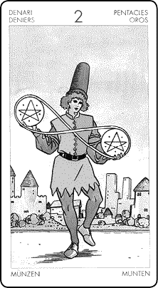 Молодой человек ловко жонглирует двумя пентаклями, выполняя неторопливые движения в форме восьмерки. Этот образ известен как лемниската и является символом бесконечности. Вы найдете его на картах Маг и Сила. Лемниската намекает, что повседневная деятельность не имеет ни начала, ни конца, потому что жонглерский акт вечен.