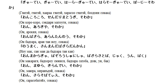 (Он макарагя, бадзороу сюнися, бадзара сатоба, дзяк, ун, бак)