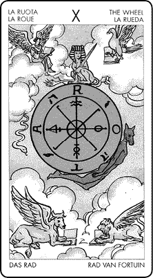 Буквы на наружной части колеса образуют слова «TAROT (ТАРО)» и «ROTA», что в переводе с латинского языка означает «колесо». Эти буквы перемежаются с буквами древнееврейского алфавита Йод, Хе, Вау, Хе, дающими начало слову «Яхве» (Jehovah), непроизносимому имени Бога. По углам карты расположены четыре фиксированные создания зодиака: Водолей (Несущий Воду), Скорпион (Орел), Лев (Лев) и Телец (Бык) – четыре зверя Апокалипсиса, символы четырех евангелистов – Матфея, Марка, Луки и Иоанна.