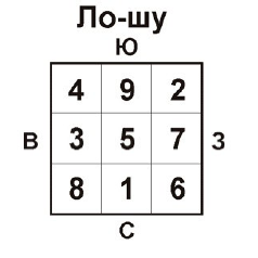 Квадрат поделен на 9 частей, каждой из которых соответствует определенное число от 1 до 9. Сумма цифр в любом направлении, в том числе и по диагоналям равна 15. Четные числа расположены по углам квадрата, нечетные – в центре и в остальных частях квадрата. До сих пор исследуются магические свойства квадрата и до конца все его секреты не раскрыты.