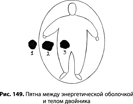 Если пятно находится на полпути между энергетической оболочкой и телом двойника, у человека может начать проявляться симптоматика заболевания (рис. 149).
