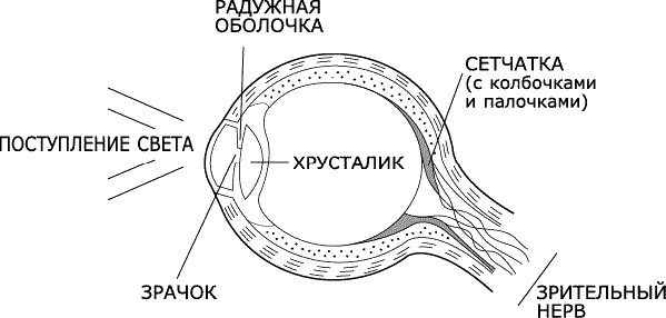 Зрачок представляет собой небольшое отверстие, которое пропускает свет (см. рис. 13). Он кажется черным по той же причине, по которой окно дома издалека выглядит черным – изнутри освещение не такое яркое, как снаружи. Зрачок, настраиваясь соответствующим образом, может пропускать больше или меньше света.