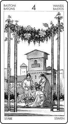 Четверка Жезлов – одна из наиболее позитивных карт отношений в Таро. Во многих колодах она изображает пару, празднующую свадьбу. Пара находится на открытом воздухе, что символизирует связь с природой и плодородие; молодые клянутся друг другу в верности и преданности, находясь в беседке, крытой листьями или купой, еврейским свадебным балдахином. Четыре жезла, поддерживающие балдахин, символизируют структуру и стабильность дома с четырьмя углами, а сам балдахин представляет собой защиту от непогоды и благословение небес.