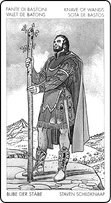 Паж Жезлов, символ огня, вероятно, самый очаровательный из всех четырех. Он молод, обладает искренним энтузиазмом и неограниченной способностью к обучению. Он отважен и смел, преисполнен энергии, честолюбия и настойчивости; быстро влюбляется и так же быстро разражается гневом. Как и огонь, он сам по себе может быть горячим и страстным. Не имея свободного места, чтобы разгореться, однако, он бывает порой неуправляем, агрессивен, неуравновешен, жесток и разрушителен.