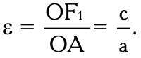 Эксцентриситет характеризует степень вытянутости орбиты. Он равен отношению расстояния от фокуса до центра OF1 к длине большой полуоси a:
