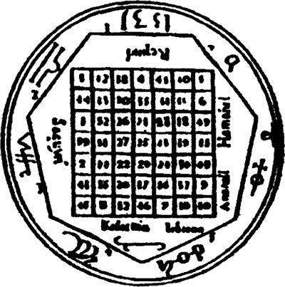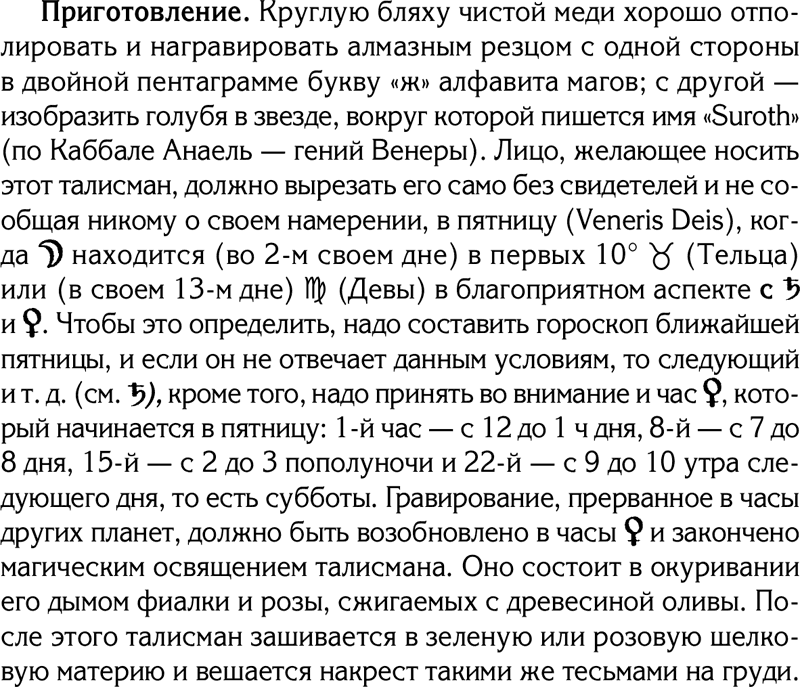 Талисман этот чаще изображается на серебре так: на одной стороне гравируется цифровой квадрат с числами от 1 до 49 или каббалистическая таблица, а с другой стороны наверху надпись «Венера» и изображение пятиконечной звезды, а под ними женщина, с левой стороны которой помещается амур с луком и с зажженной стрелой, она держит в левой руке музыкальный инструмент.