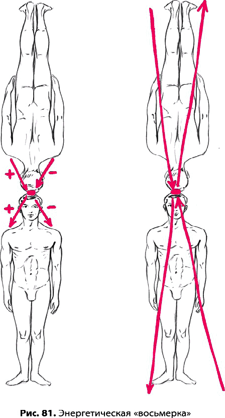 Вспомним нашего энергетического двойника. Он стоит у нас на голове вверх ногами, обращенный лицом назад. При этом положительная энергия поступает наискосок через первую чакру с его правой стороны к нашей правой, а отрицательная – наоборот. Потоки энергии идут наперекрест друг другу: получается фигура, внешне похожая на песочные часы (рис. 81).