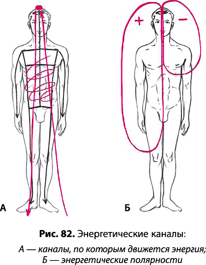 Каналы, по которым движется эта энергия, находятся внутри, но это не меридианы (и они не нуждаются в чистке). По меридианам проходит внутренняя энергия, которую мы получаем через первую чакру. А внешняя создает наше энергетическое поле, и вместе с внутренней энергией она перемешивается в нас (рис. 82).