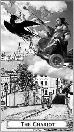 Прилагаю свой эскиз и Колесницу «Пражского Таро».[22] Собственно, грифоны впервые появились в Пражском Таро, но у нас есть свои ленинградские, вот и вдохновилась.