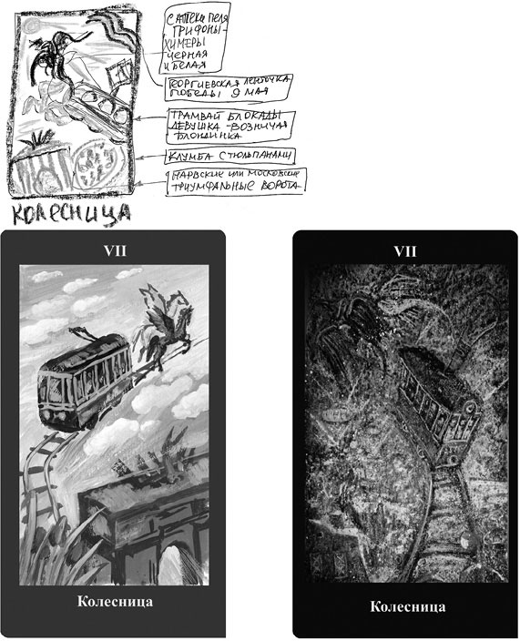 Колесница «Таро Петербурга» – это, конечно, Трамвай: и гумилевский «Заблудившийся трамвай», воспетый и обпетый многими, и блокадный трамвай триумфа, который несут в небо грифоны, живущие в аптеке Пеля.
