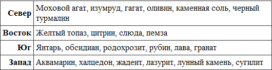 Если вы отмечаете четыре стороны света в круге свечами, а не большими камнями, положите вокруг каждой свечи любые (или все) перечисленные далее камни.