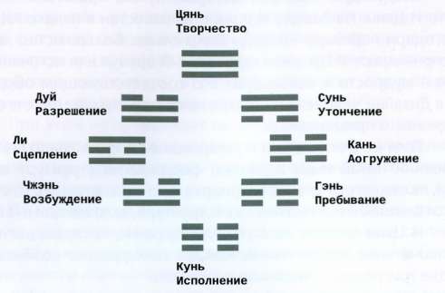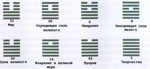 Но нас будет интересовать структура как таковая. Структуру можно математически представить в виде бинарного кода (о или 1). Если восемь существующих триграмм (2 в 3-ей степени) скомбинировать друг с другом — получится 64 гексаграммы. (Сведение ко/1 коду не совсем правильно, т. к. при этом теряется много детальной информации. Но таким образом можно увидеть все возможные комбинации)[18].
