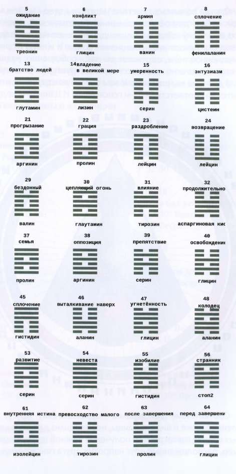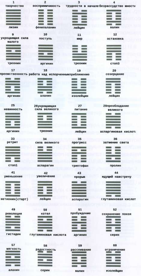 Т.к. каждая аминокислота кодируется тройной комбинацией (триплетом) нуклеотидов, гексаграммы И-Цзин можно соотнести с соответствующими аминокислотами.