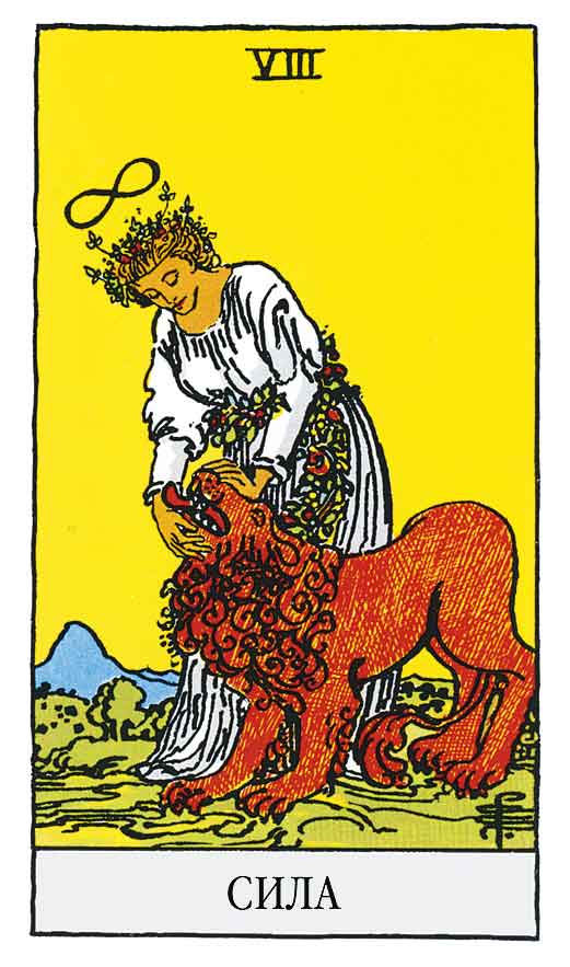 – Второй аспект: женщина держит зверя за пасть, сворачивая ему челюсть (на некоторых колодах – прижимая ему язык или разрывая пасть), это символ правильного приложения своих сил – вы подчинили себе силы Кундалини и направляете ее куда нужно, она находится у вас под контролем. Вы всегда знаете, что именно, когда и для чего необходимо сделать.