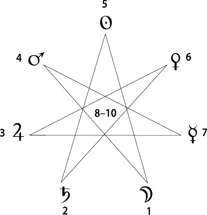 Как мы видим, каждый угол семиконечной звезды увенчан символом той или иной планеты: Луны, Сатурна, Юпитера, Марса, Солнца, Венеры и Меркурия. За знаками планет следуют цифры – это номера позиций, согласно которым извлеченные из колоды карты Таро укладываются на алтарь. Стартовой отметкой расклада является Луна, расположенная в правом нижнем углу септограммы. Данная позиция хранит информацию о бессознательном человека, его удовлетворенности или разочарованности в областях домашнего комфорта, уюта и семейного быта.