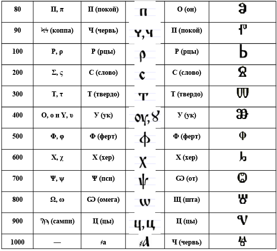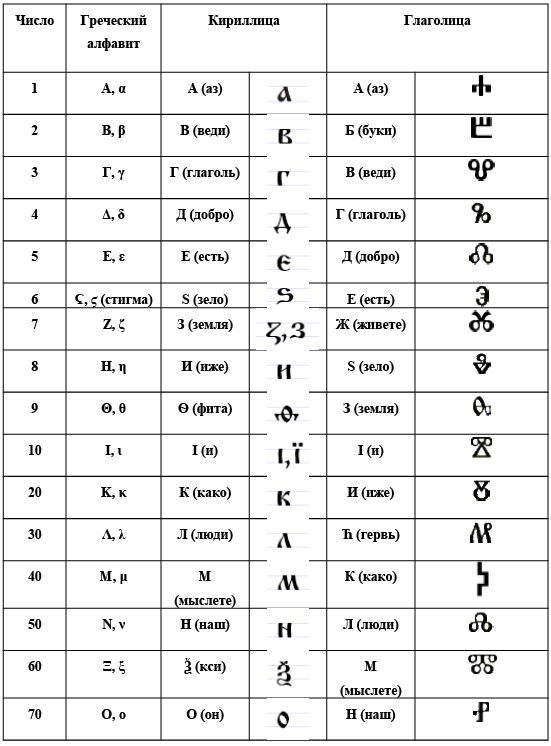 Таблица соответствия кириллицы и глаголице арабским цифрам