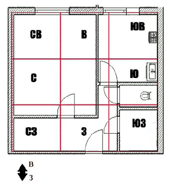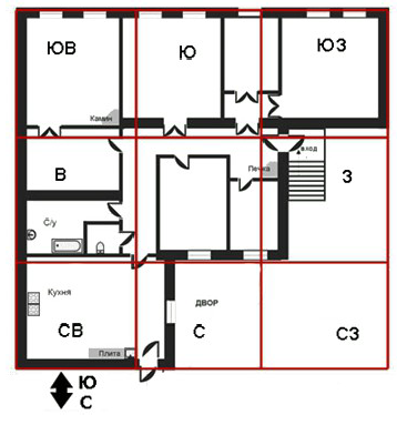 Допустим, вы получили измерение в 350 градусов. Согласно таблице, это Север. Ось, относительно которой дом ориентирован в пространстве – Север-Юг. Записываем в верхнем и нижнем центральных клетках «Север» и «Юг», и далее расписываем все остальные дворцы.
