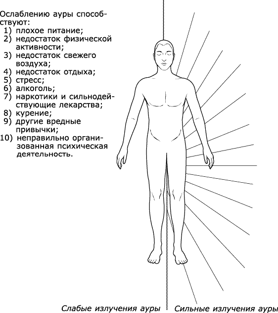 И хотя сведения о размере и мощности ауры древних учителей не имеют подтверждения, доподлинно известно, что чем здоровее человек физически и духовно, тем сильнее будет вибрировать его энергия, и тем дальше от его физического тела будет распространяться аура. Чем жизнеспособнее ваша аура, тем больше у вас энергии для осуществления своих планов. Чем сильнее ваша аура, тем меньше вероятность того, что вы подвергнитесь воздействию внешних сил.