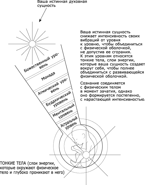 Аура, или энергетическое поле, человека включает в себя два аспекта. Во-первых, ауру, как описано в традиционной метафизике, составляют энергии ваших тонких тел. Эти тонкие тела представляют собой слои энергии различной интенсивности, которые окружают и пронизывают ваше физическое тело (см. рис. 4). Их основная функция заключается в том, чтобы оказывать помощь в координации и регулировании деятельности души в материальном мире. Особенности тонких тел в этой книге не рассматриваются. Достаточно, если вы просто будете считать их составной частью аурического поля.