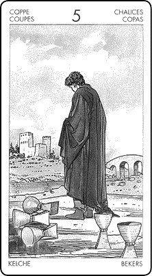 «Лучше любить, да потерять любовь, чем никогда не познать ее», – говорил лорд[29]. И он, вероятно, был прав, хотя мы и не можем знать этого наверняка. Особенно глядя на Пятерку Кубков. Эта карта является графическим образом потери и печали.