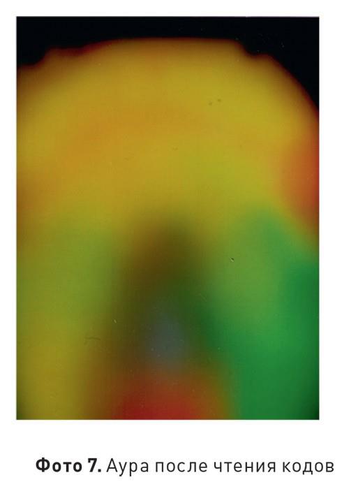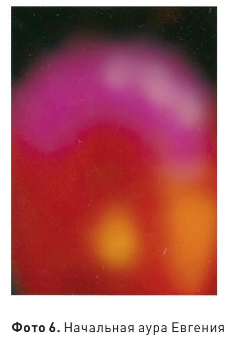 Но до их чтения, в целях оздоровления, я решил провести с ним эксперимент с использованием кодов Н. Мараховской, чтобы эффект фантома не мешал. Я сразу снял его начальную ауру (фото 6), и она же должна была послужить для сравнения с последующими изменениями ауры после применения кодов и чтения ваших книг. Таких экспериментов мы ещё не делали. Начальная аура (фото 6) была обычной и говорила, что её владелец ведёт активный образ жизни, с чем Евгений согласился. Лиловый цвет вверху свидетельствовал, что человек созрел для перехода на следующий Уровень.