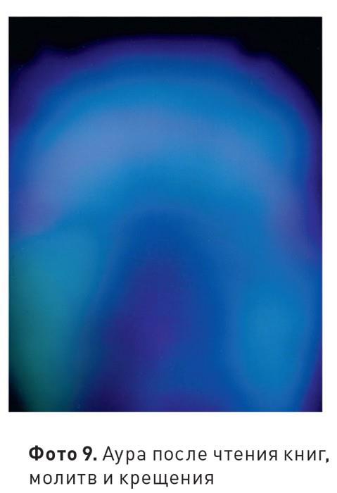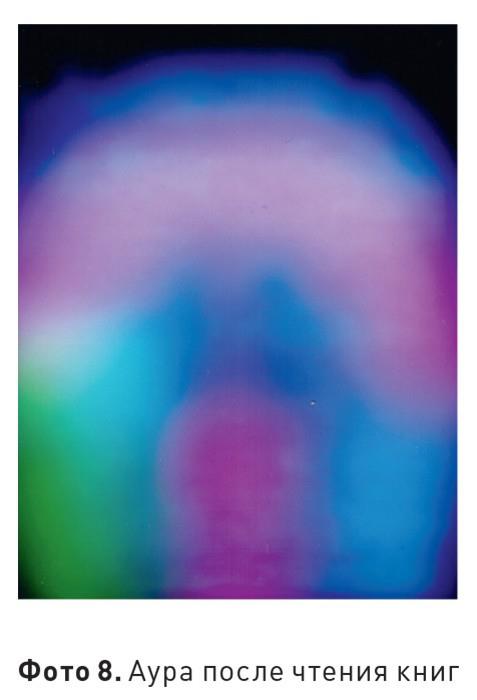 Далее мы расстались, и Евгений начал читать ваши книги. В назначенный день после трёх недель был сделан новый снимок (фото 8). Но исходным для сравнения оставалось фото 6. Цвет ауры изменился, красный и тёмно-лиловый цвета, преобладающие на начальном фото 6, исчезли. Стали преобладать розовый и голубой. Эти изменения явились результатом работы с книгами в течение трёх недель! На этой фотографии вы уже не найдёте того агрессивного и эгоистичного человека, каким он был три недели назад. (Надеюсь, Евгений простит меня за такое прямое высказывание). И тогда я попросил его ещё почитать по 3 раза новые молитвы и покреститься по новой схеме».