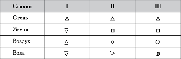 Различные варианты традиционного изображения стихий приведены в табл. 10. Наиболее общеупотребительными являются изображения в колонке I.