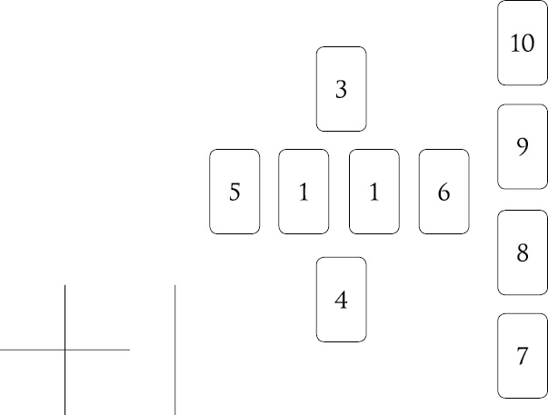 В раскладе используются Старшие и Младшие арканы; треть колоды, как обычно, должна быть представлена перевернутыми картами. Озвучивая вопрос, мы, как и прежде, должны разбивать колоду на три стопки. После чего, объединив три группы карт в одну колоду, мы можем приступать к раскладу. Извлекаемые из колоды карты должны быть размещены на алтаре так, как показано на схематическом рисунке ниже. Арканы должны выкладываться исключительно рубашками вверх.