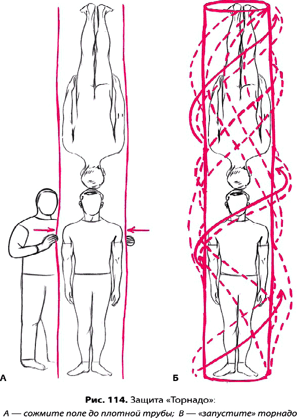 Для начала встаньте около пациента, дайте команду подсознанию и начинайте руками сжимать его поле. Когда поле сожмется до нужной вам плотности, вы получите достаточно плотную трубу, внутри которой будет много свободного места. Труба будет эластичной: если человек внутри нее захочет пошевелить рукой или ногой, она растянется до необходимой для этого длины, как рукав мягкого трикотажного свитера. Высота этой конструкции должна равняться двум ростам пациента, поскольку труба должна защищать и его двойника тоже (рис. 114).
