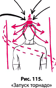 После того как вы собрали всю энергию пациента в полый столб, вы должны «запустить торнадо». Сосредоточьтесь на трубе и начинайте враскачку закручивать ее – любой рукой, в любом направлении. После одного-двух толчков энергия начнет крутиться. Это движение не быстрое и не равномерное: вы не увидите ровную стену энергии, а, скорее, увидите колеблющуюся завесу (см. рис. 115).