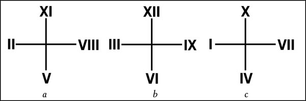 Начальные дома каждого квадранта (I, IV, VII и X) называют угловыми. Эти дома в гороскопе являются главными. Действительно, крест угловых домов (рис. 38a) состоит из осей ASC – DSC и MC–IC, которые составляют костяк гороскопа, являются его основой.