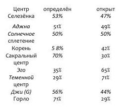Переходя теперь к открытым центрам, нужно вспомнить общую информацию о них: здесь ни одно конкретное качество не фиксируется надолго. Поэтому там, где мы открыты, нет ничего, на что можно было бы положиться. Открытость означает не только отсутствие фиксации, но и то, что в соответствующих центрах всегда случается обуславливание. Вероятность обуславливания может быть разной, но она всегда есть. Чтобы точнее понять этот аспект, посмотрим на процентное соотношение людей с открытыми и определёнными центрами.