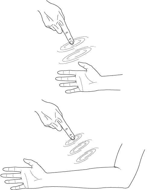 4. Через несколько минут после этого медленно начните очерчивать указательным пальцем небольшой круг. Визуализируйте, как поток энергии, спиралями выходящий из вашего указательного пальца, создает кольцо энергии, которое касается раскрытой ладони другой руки (см. рис. 12).