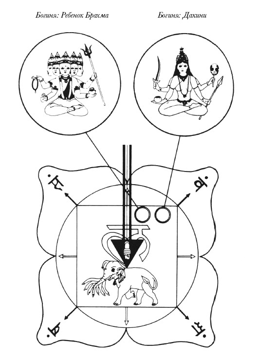 Внутри квадрата находится маленький треугольник, направленный вниз от столба энергии, изображающего сушумну. Это символизирует направленную к земле нисходящую силу чакры. Внутри треугольника – змея кундалини, свернутая вокруг лингама Шивы, указывающего наверх. Эта чакра – жилище и место, где спит кундалини. Под треугольником находится слон с семью хоботами по имени Айравата, он символизирует тяжелые, сходные с материей свойства этой чакры и семь путей отсюда, каждый из которых соответствует одной чакре. Также мы можем связать с этой чакрой слоноголового бога Ганешу, повелителя препятствий, поскольку он устойчивый, с толстым пузом, и он доволен своей телесностью. В квадрате изображены еще божества: разгоняющий страхи пятиликий Брахма-ребенок и богиня Датни, воплощение Шакти на этом уровне, он держит в руках трезубец, меч, чашу и череп. В центре квадрата располагается обозначение семенного звука, который, как считается, содержит в себе суть чакры. Это звук Лам. Все эти изображения и звуки могут быть использованы как символы для медитации над этой чакрой.