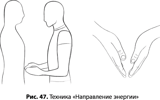 Движение выполняется двумя руками. Плотно сомкнув пальцы каждой руки, сложите руки клином, но так, чтобы они не соприкасались. Широкий конец клина будет между запястьями, а сужение – у кончиков пальцев. Руки, направленные под углом друг к другу, направьте перпендикулярно на проблемное место. Не напрягайте их. Между вашими ладонями начинает собираться энергия, которой будет необходим выход. Ваш «клин» образует что-то вроде брандспойта: поскольку просвет между пальцами будет узким, энергия с их кончиков начнет с силой выходить в проблемную точку (рис. 47).