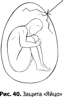 Самый распространенный и вместе с тем самый слабый вид энергетической защиты. Человек представляет себя внутри яйца, окруженным скорлупой. Тот, кто сидит в яйце, чувствует себя защищенным, но на самом деле этот вид защиты очень слабый. Простейшее, даже случайное воздействие извне – и по скорлупе пойдут трещины. Даже если скорлупа двойная и тройная, она все равно треснет (рис. 40).