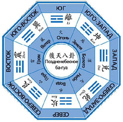 А вот для практики используется другое распределение триграмм в Ба Гуа. Эта система называется Посленебесное Ба Гуа (Или Ба Гуа позднего неба). Эта система описывает все, как обстоит в жизненной реальности.