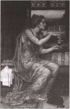 Любовный напиток. Картина Э. де Морган (1903). В правом нижнем углу — кандидат в фамильяры.