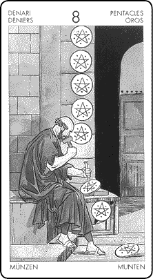 Традиционно Восьмерка Пентаклей известна как карта благоразумия. В астрологии она ассоциируется с первым десятком градусов Девы, где Солнце светит тем, кто усердно трудится.