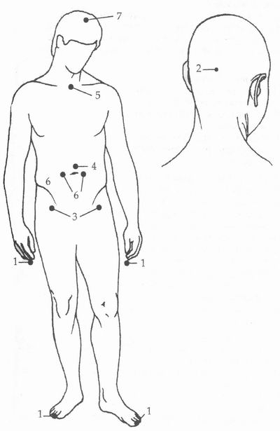 Двадцать местоположений: кончики пальцев на ногах и на руках