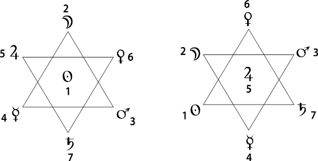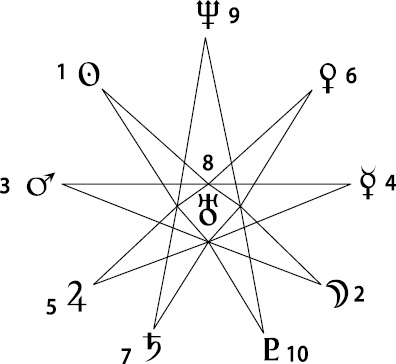 Планета, расположенная в настоящий момент в центре девятиконечной звезды, определяет следующее космическое тело (которое ставится на вершину конструкции). Если в центре звезды находится Уран, то на вершину встает Нептун. Остальные небесные объекты расставляются по лучам звезды – Плутон, Солнце, Луна, Марс и т. д.