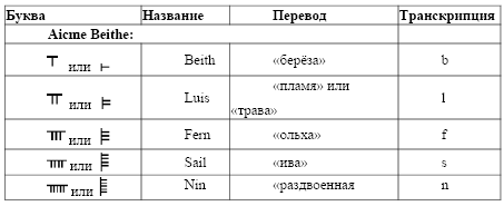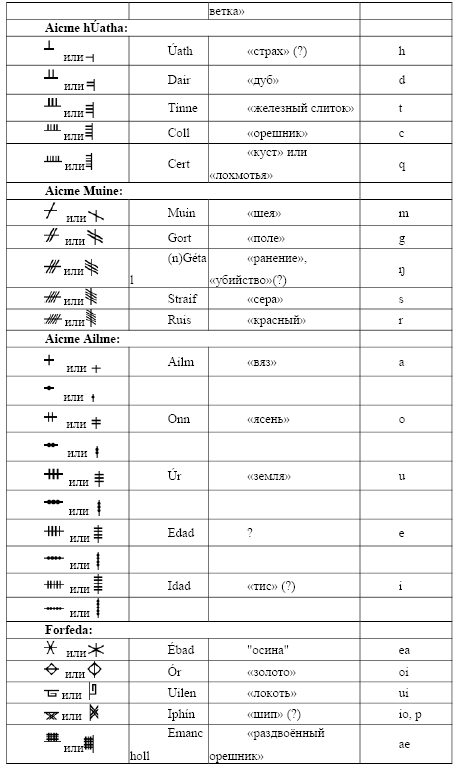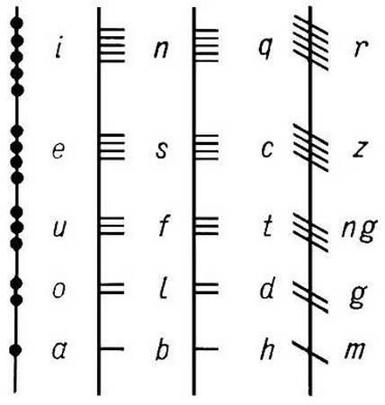 Алфавит Деревьев состоял из четырех групп букв: трех для согласных и одной для гласных. Согласные обозначались черточками от одной до пяти, гласные – точками, также от одной до пяти.
