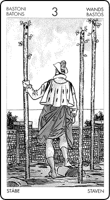 Традиционно Тройка Жезлов известна как карта упрочившейся силы. Мужчина на карте создал свою крепость, символами которой являются три прочно укорененных молодых деревца.