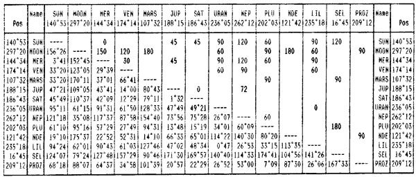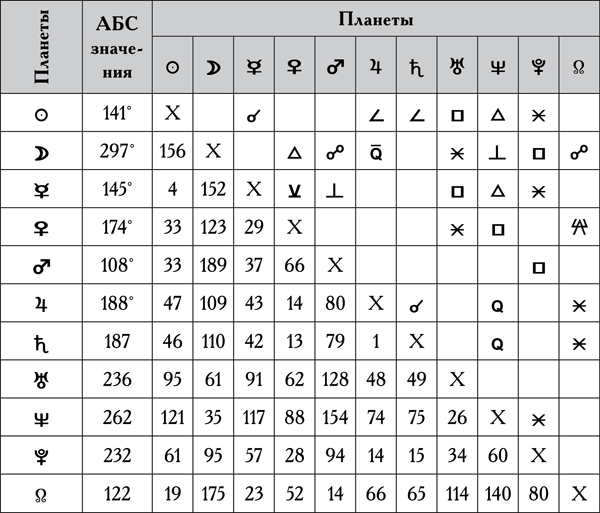 Таблица 24. Аспекты планет, рассчитанные на компьютере при помощи программы ADB-PROF 3.0 для гороскопа Ивана Владимирова