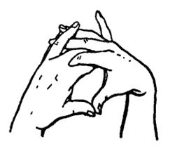 Методика исполнения: соединить кончики больших пальцев правой и левой рук. Указательный палец правой руки расположить на указательном пальце левой руки, под средним пальцем левой руки. Средний и безымянный пальцы правой руки поместить на среднем пальце левой руки, под безымянным пальцем левой руки, расположив их кончики на мизинце левой руки. Выпрямить мизинец правой руки.
